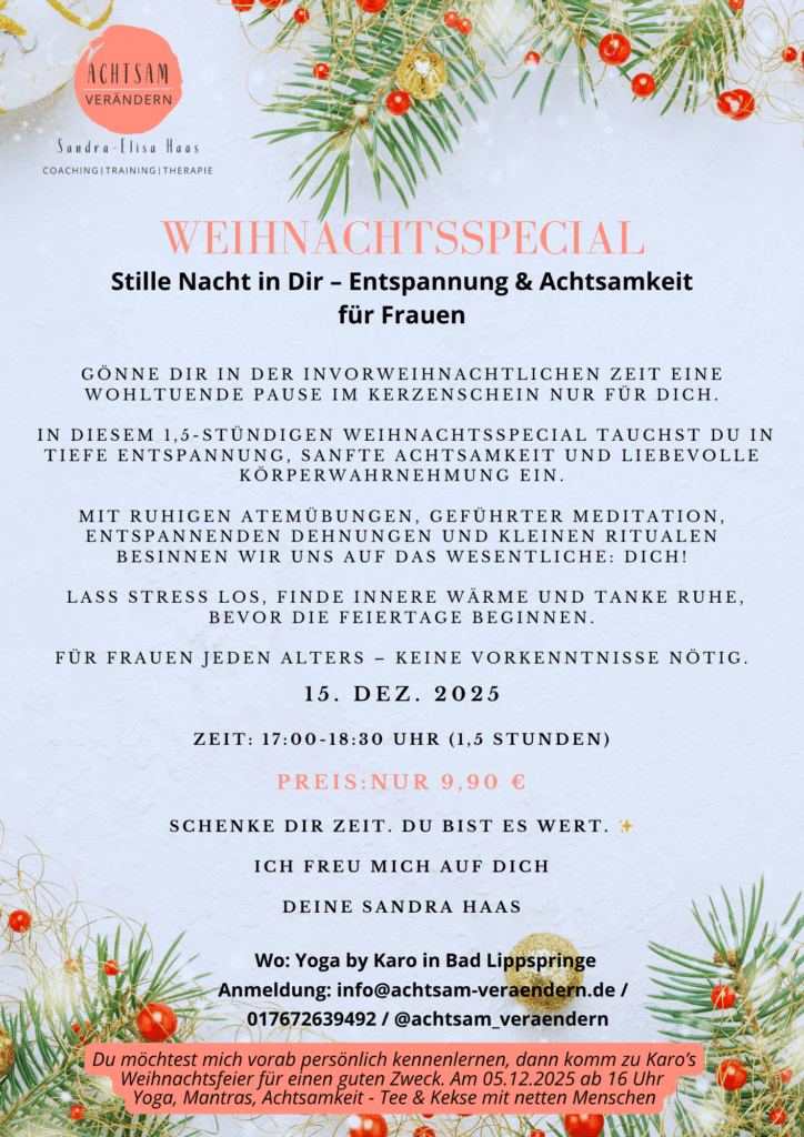 In diesem Online-Intensivkurs erwarten dich kraftvolle Achtsamkeitsübungen und  wohltuende Meditationen, die dir helfen, Stress loszulassen und mit mehr Ruhe und Gelassenheit ins neue Jahr zu starten.